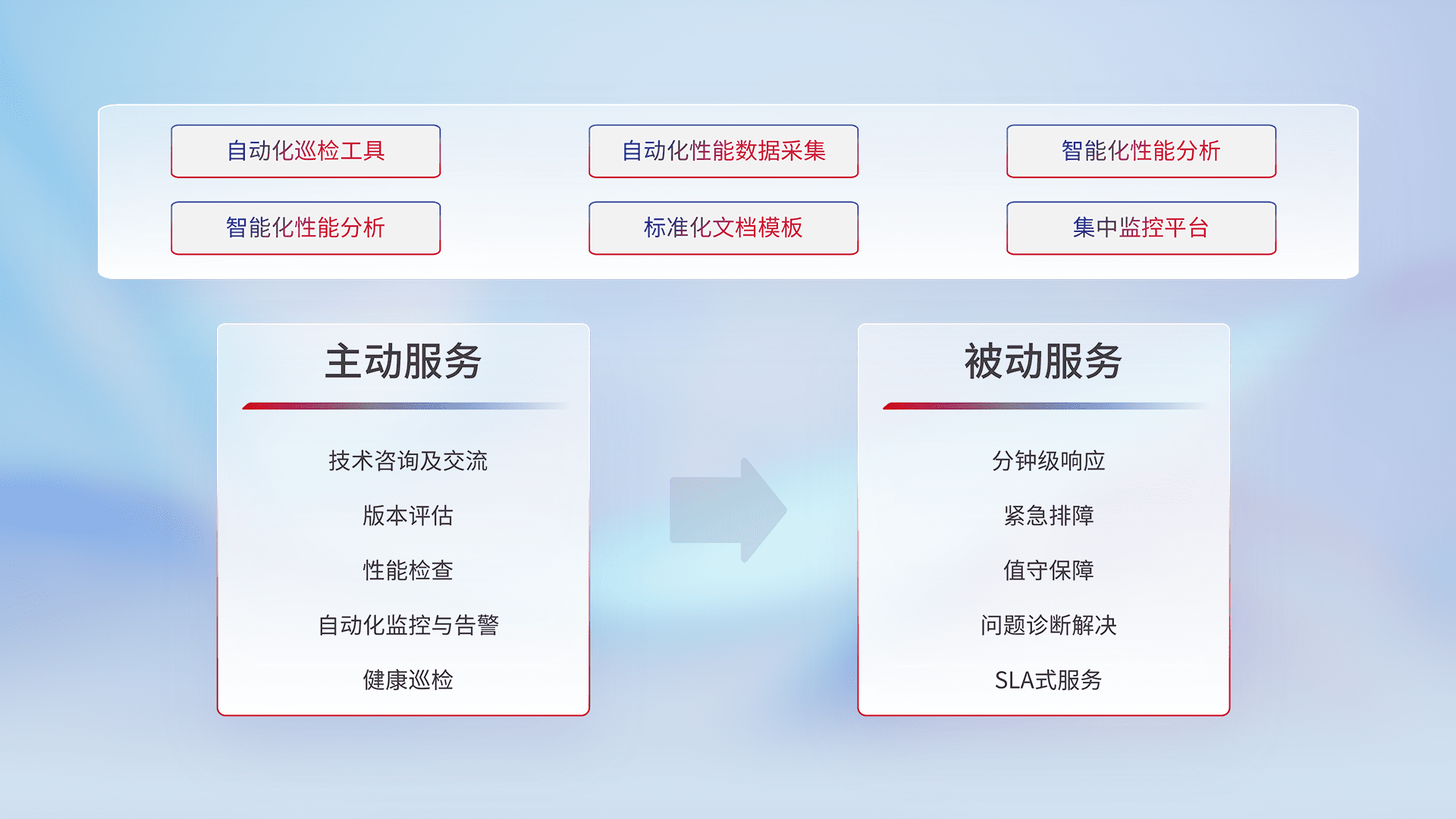 智能化工具和标准化文档,,保障服务质量,,,提供主动服务(包含技术咨询、、、、版本评估、、、性能检查、、自动化监控与告警、、健康巡检)和被动服务包含(分钟级响应、、、、紧急排障、、值守保障、、、、问题诊断解决、、、、SLA服务)。。